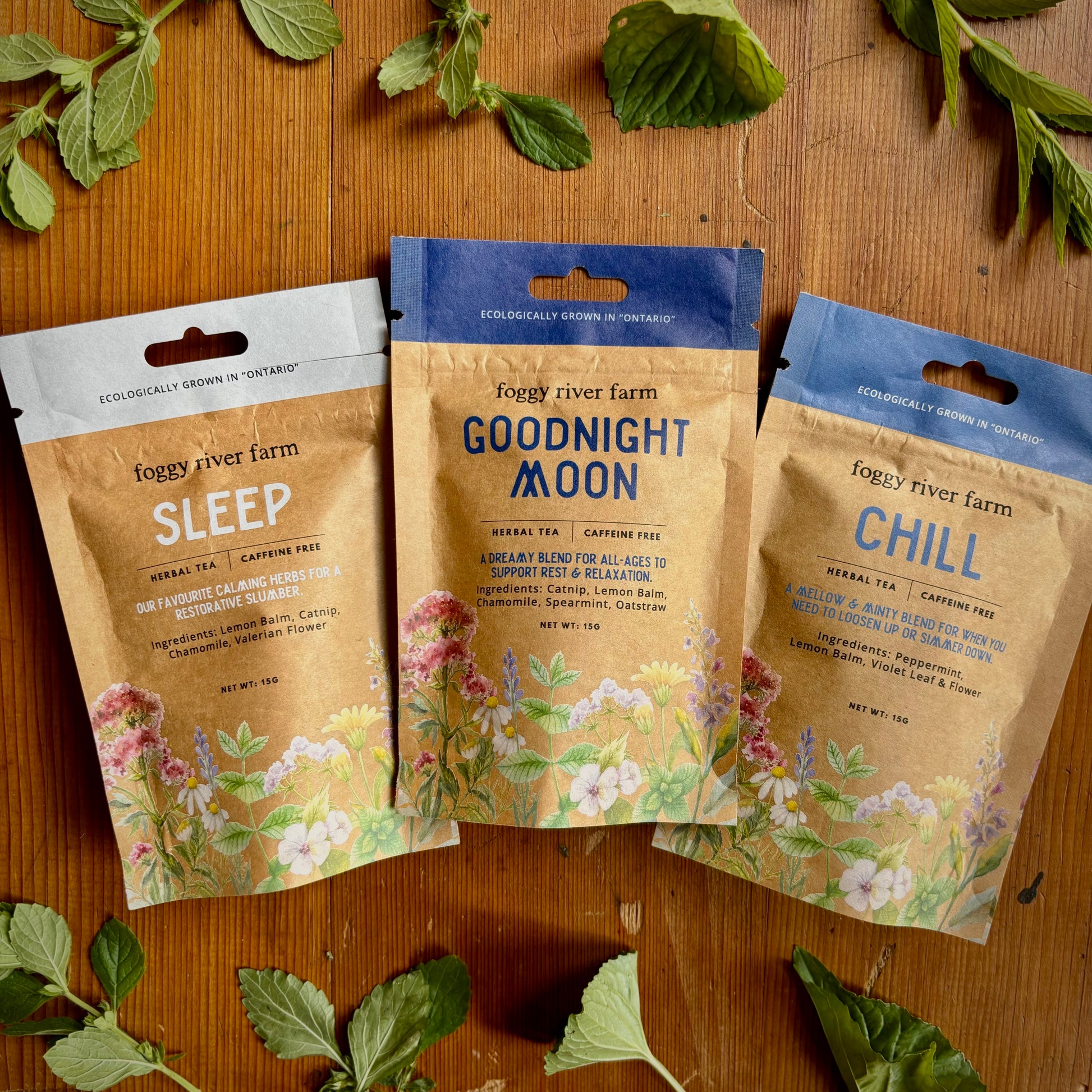 Chill, to enjoy anytime throughout the day to bring you to a more relaxed state. Goodnight Moon, a favourite every-day wind down tea, with herbs to calm the body and mind. Sleep, our powerhouse formula with valerian flower, for when you're ready for that shut-eye.