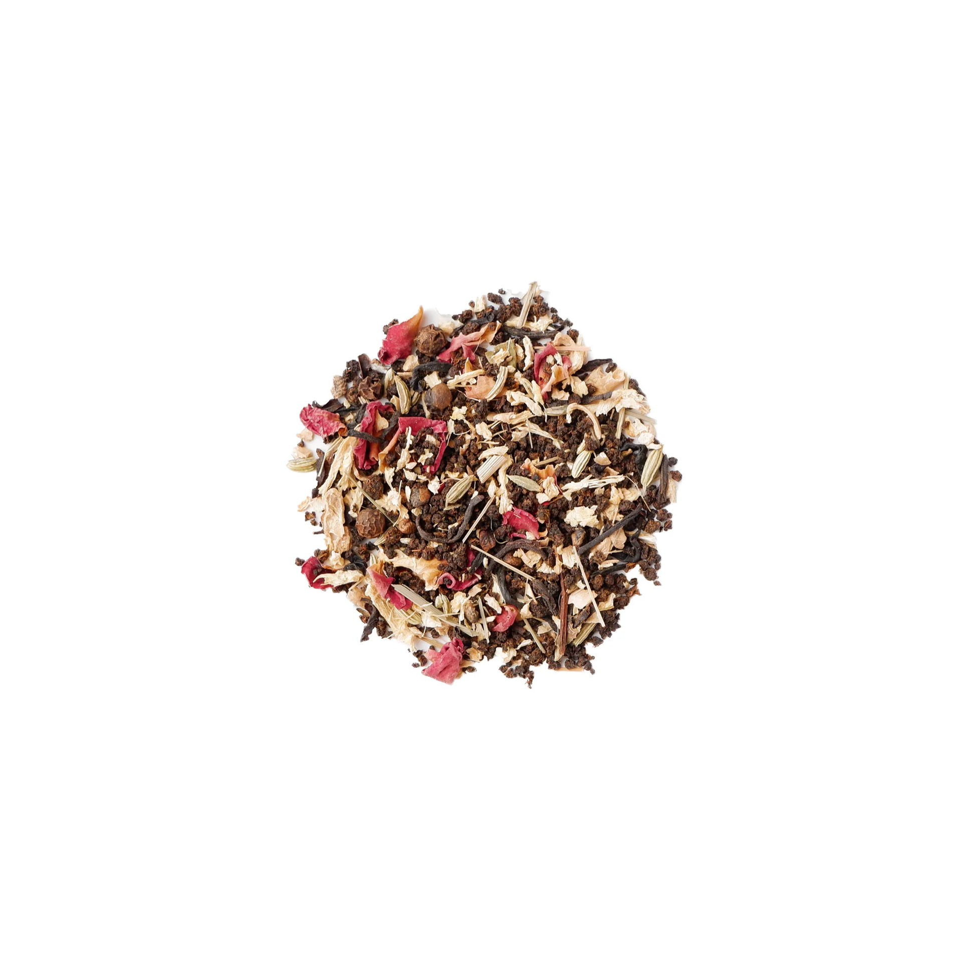 Black Tea, Ginger, Cardamom, Fennel, Black Pepper, Lemongrass, Rose Petals